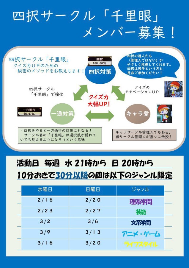 #四択サークル 毎週水曜日21時〜、日曜日20時から定例会を開催しています。 30分からの回はジャンル限定で今週は文系学問です。是非、ご参加ください!