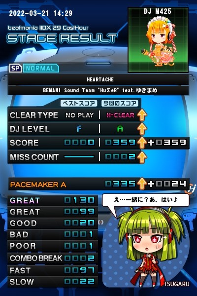 昨日(3/21)のやらかし ☆3 HEARTACHE (SPN) H-CLEAR & A フルコン狙おうと思ったらサビの皿+1鍵と最後の連皿でやらかしてしまった...ライトニング筐体でやったから連皿やりやすいんですけど光らせにくいわ...次はEXHとMIRRORつけてやるかな。 #IIDX