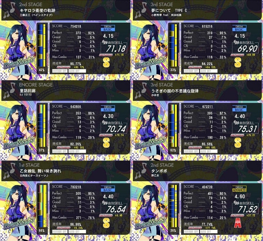 ドラムサイド新規Lv4進軍集。 童話回廊以外は全てセッションからの収穫になっています。 私の方から移植関連で楽曲提供したり未解禁曲をプレイさせてもらったりと充実してました (^^) 最高クリア難度も大幅に更新。 本家キヤロラ衛星は現在開催中のイベントで解禁できるかも?