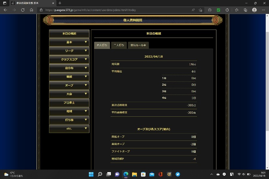 天国から地獄へ堕ちるとはまさにこのことだろう。 半荘リーグ 1対局 4位 -0.3 立直 2回 和了 5回 放銃 3回 南1局 突然地獄が訪れる。音が途切れ始めたと思ったら・・・回線が不安定になり殆ど捨牌の選択が出来ず。 (朝一で回線が重く使い物にならない。) 3連続 自分の意思と関係ない牌を切り放銃。 (45.0→10.0 数字は大体の値) ふてくされて、わざと遅延行為していると思われるのも嫌なので、 さすがに途中退出を選ぶ。 同卓された方、申し訳ございませんでした。 今日はここまで お疲れ様でした。