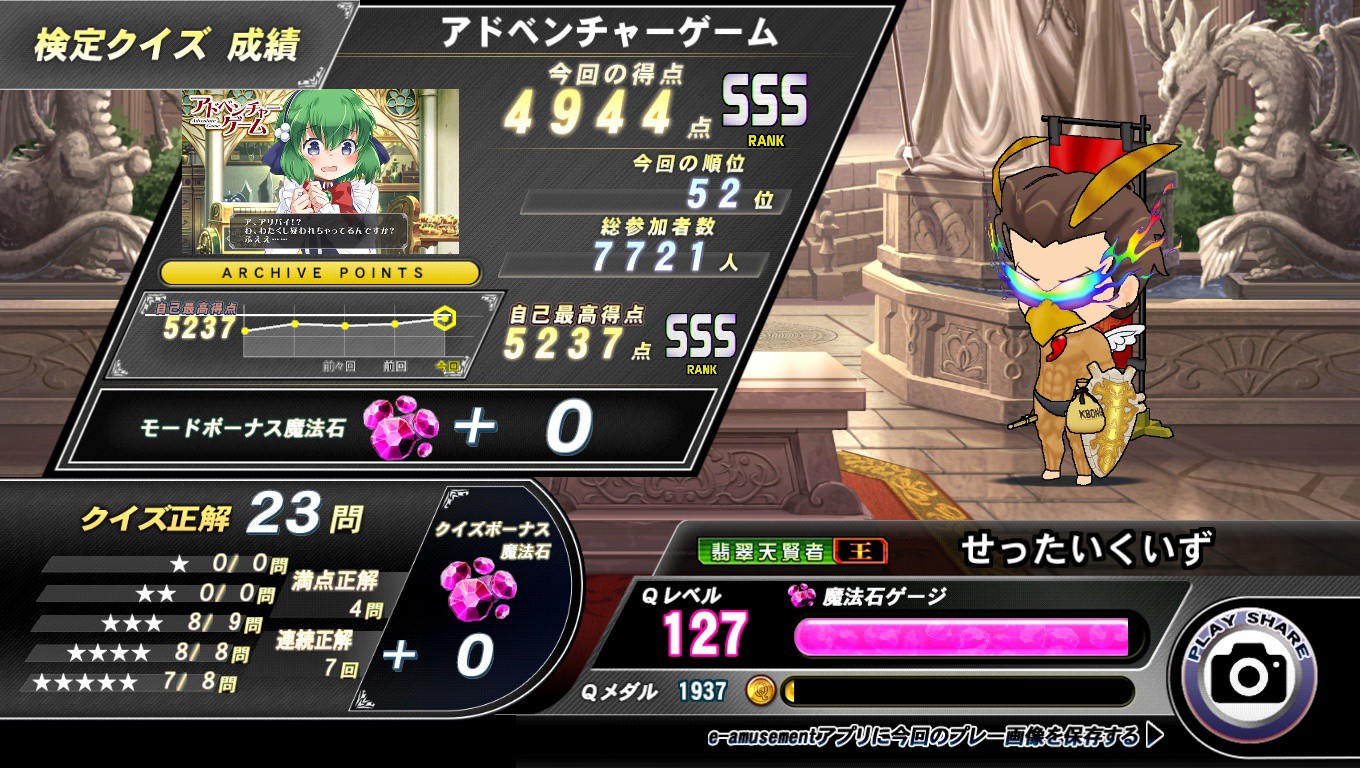 AVG検定 久々に5000点に届くかと思ったらそんなことはなかった… 始めの方で1問落としてたので気にしてなかったですが、もし全答取ってたらワンチャン自己ベもあったかも知れません まあ覚えてないのですけど!