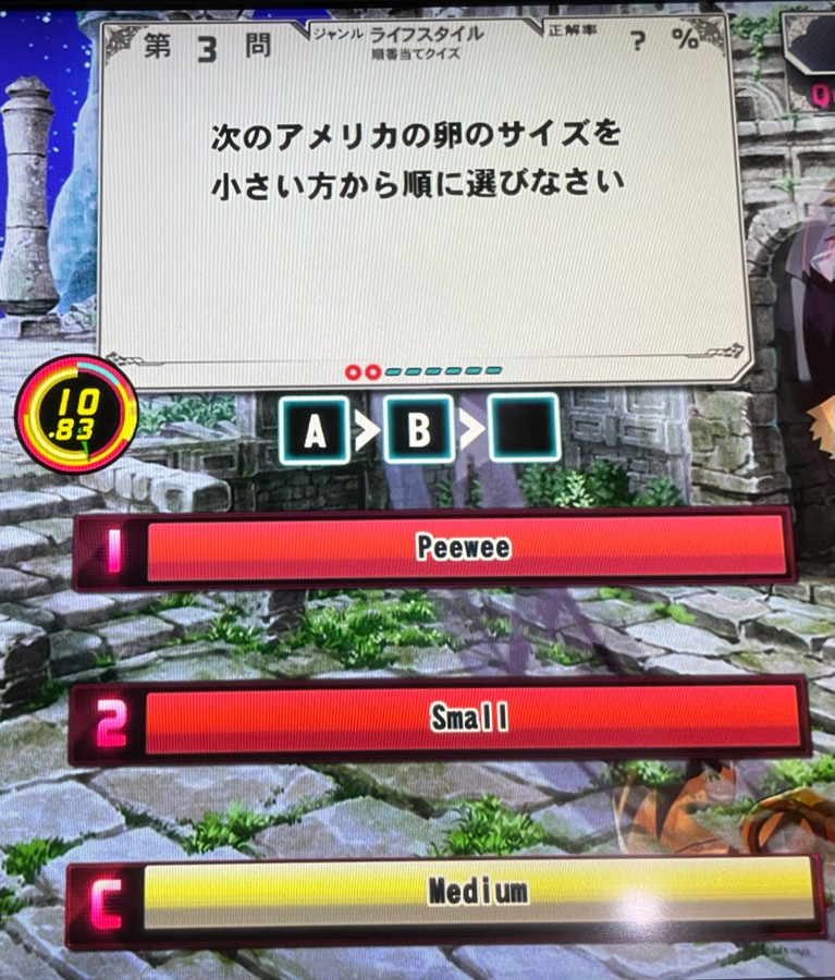 たまご問 peeweeの意味がわからないので適当に選んでみましたが正解だったようです。peeweeは「ちび」を表すスラングだそうで アメリカの卵は日本と同じく重さでサイズが分けられ、小さい順に Peewee Small Medium Large Extra Large Jumbo の6段階 日本はSS、S、MS、M、L、LLの6段階で重さ的にはだいたいアメリカの6段階に対応してますが、PeeweeはSSよりも小さいっぽいです 私、そもそもSSもスーパーでは見たことないんですが 普通にお店で売ってる小さいやつ(Mサイズ)は殻付きで58g アメリカのLargeが57g(2oz) 日本のSSは40g アメリカのPeeweeが35g(1.5oz) うずらの卵は10g ちょっと想像がつきにくいのですが、M玉とうずらの中間くらいなんですかね…