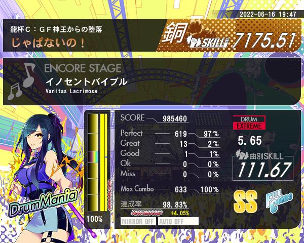 ドラム調子悪いのが続いていたけど今日はちょっと調子良くなってた😆 今までSSすら取れてないから頑張った(*・∀-)b
