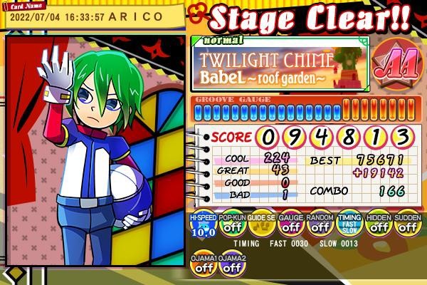 トワイライトチャイム(N)スコア更新、これで19のフォルダN譜面埋まった、少しムービーに目行っちゃって出たBADあるけど、曲ちゃんと覚えたら上がりそう。