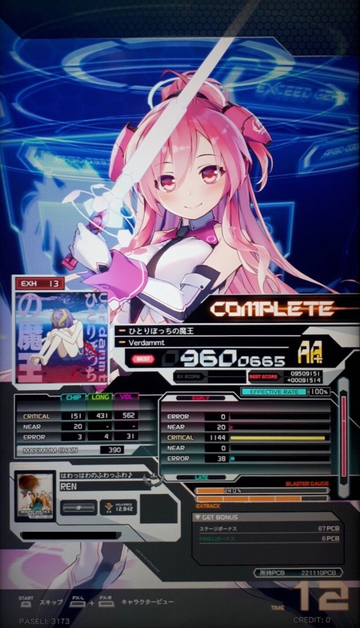 ひとりぼっちの魔王EXHでスコア更新(やったぁ)。個人的に勇者登場前の部分が1番難しいと思う。デバイスが常にダブルであるだけでも複雑なのに、そこにFXチップが混じったりするから本当複雑で全然見切れない…。orz