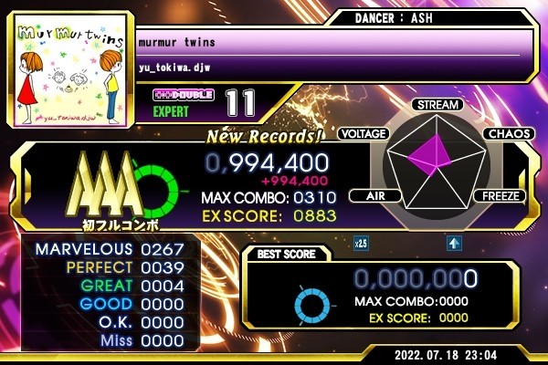 昨日の良収穫 足11……にしては結構しんどい配置とリズム難。 時折見える16分が3連に見えてしまう恐ろしい譜面。 そろそろ鬼追加ラッシュしてる流れで鬼18入れても良いのよ! 寧ろ歓迎する。