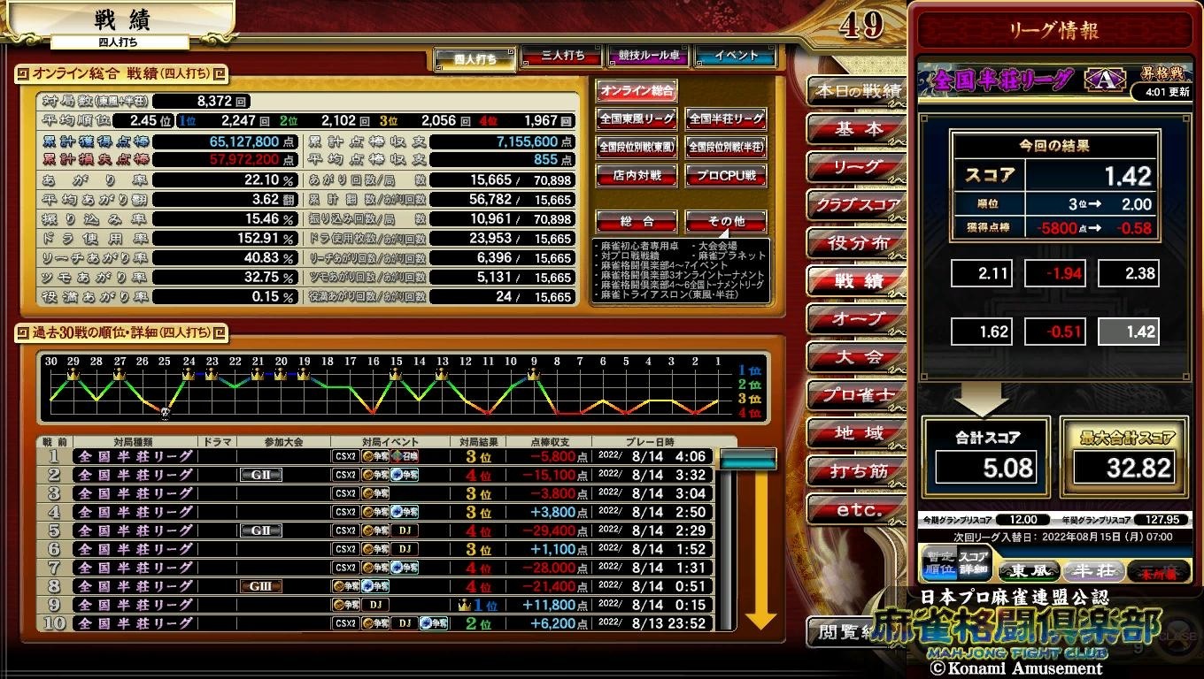 スランプグラフ見ると好・不調の波があからさま。 不調時の北家スタート時は本当に勝てない。 自分の親が回ってきた時にはもう10000点割るか否かという展開ばっかり。