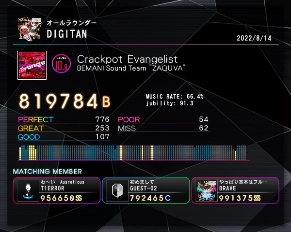 えーまさかのフルコンチャレンジでCrackpot Evangelistを引き当てたのでやりました。 マジで創作譜面を疑うレベルの難しさです 簡単なの最初だけ。ゼノヴィアやレイズよりボコられてる。 詳しくは分からないが、jubeatの譜面で一番難しいかもしれない。