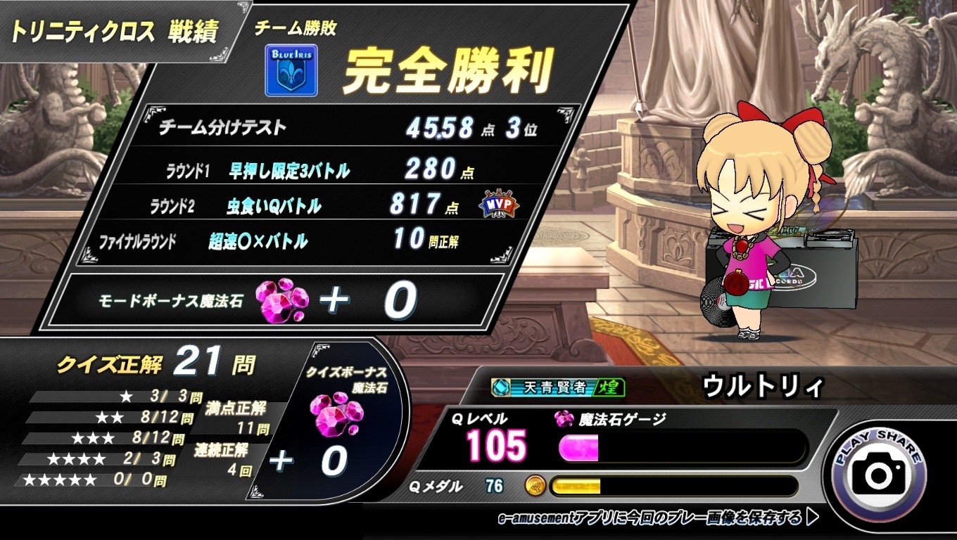 今日はこの辺りで撤収します。 何とか天青賢者煌に上がりました、ほとんどアーケードゲーム検定を回してきましたが、何度かトリクロと協力プレーを堪能してきました。 アプリユーザーの方ともマッチング出来ました ありがとうございましたm(_ _)m