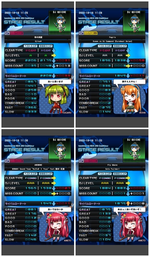 最終プレーは好きな曲とFly Aboveで! 青の洞窟・・・音の美しさと静寂さに心惹かれました Fegrix・・・曲後半の盛り上がりがお気に入りです、灰がフルコン出来そうで出来ない ANEMONE・・・曲も譜面も素晴らしいの一言、すごく光るしやってて気持ちいい(*´ω`*) Fly Above・・・やっぱり名曲(*´ω`*)そろそろ1900点超えたいところ 次回はいよいよナンバリング30!スゴイ(・∀・) でも多分私は次回作でもいつも通りマイペースでプレーすると思いますので、今後ともよろしくお願いします!(≧▽≦)