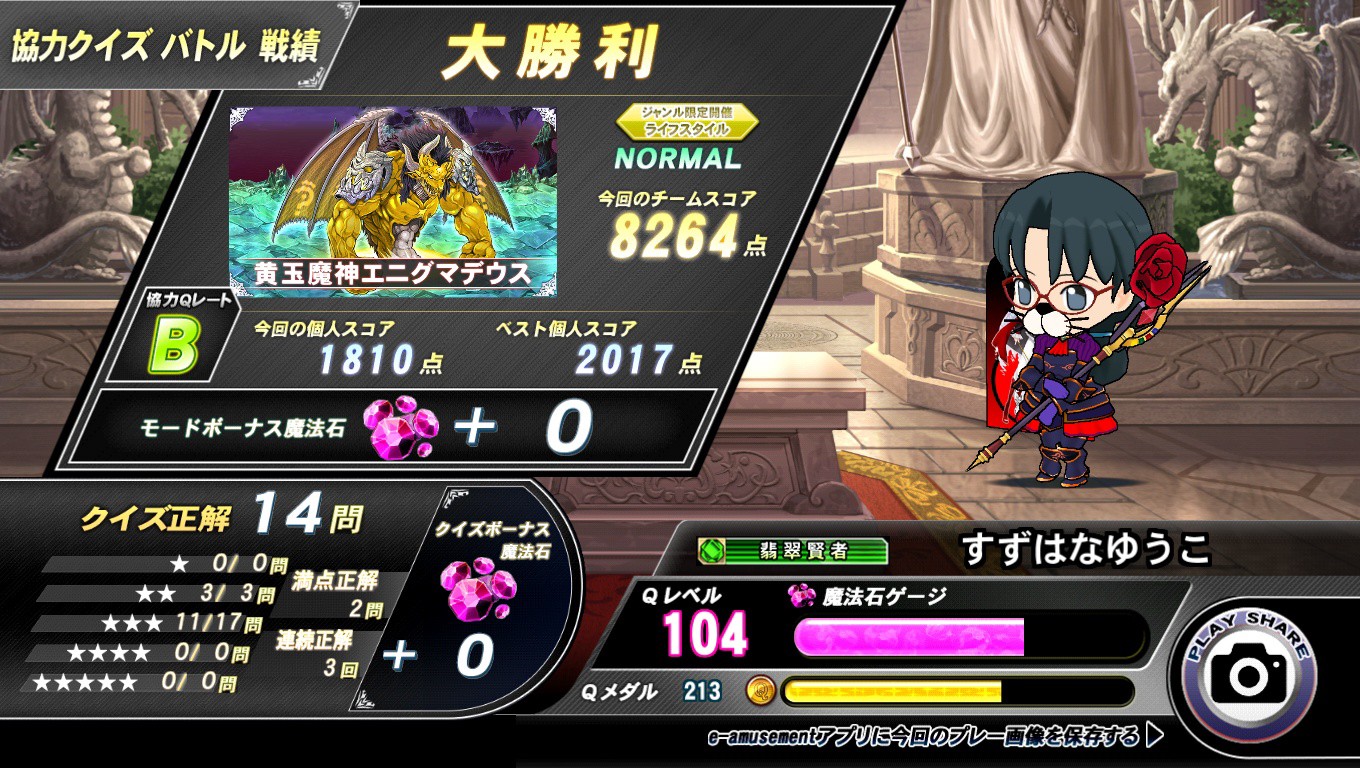今日の協力クイズ黄金伝説(黄玉魔神)ノーマル大勝利回。ハード?期待を大きく裏切る敗戦だった...もう何も言えないし、こればかりは仕方ないでしょう。Mリーグ問題も出たし後はどれを強化すべきか課題である。