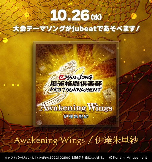 10月26日(水)より eスポーツ大会「eMAH-JONG 麻雀格闘倶楽部 プロトーナメント」テーマソング登場! 『Awakening Wings/伊達朱里紗』がjubeat Ave.であそべるようになります♪ eMAH-JONG 麻雀格闘倶楽部 プロトーナメント公式サイトはこちら http://eagate.573.jp/game/emp/