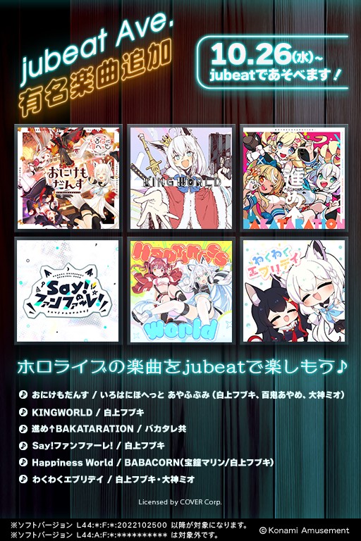 10月26日(水)より #ホロライブ の楽曲が jubeat Ave.であそべるようになります♪ ▼収録曲 おにけもだんす KINGWORLD 進め↑BAKATARATION Say!ファンファーレ! Happiness World わくわくエブリデイ アプリ版jubeatでもあそべる!詳しくはこちら! http://eagate.573.jp/game/jubeat/mobile/