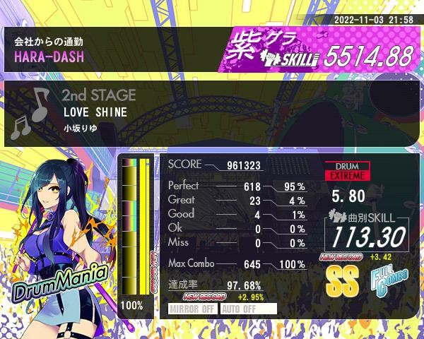 LOVE SHINE ちょくちょくプレイしていた曲でようやくフルコンボとれた! 個人的に感慨深いです。