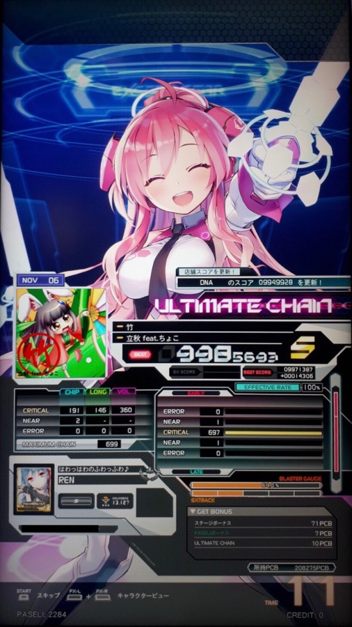 竹NOVで2NEAR残念賞まで詰めれたかぁ(しみじみ)。今更だけど、この曲ってハイスピはどこに合わせたら良いんだろうね?w(待て) 自分はラストの高速(BPM300前後)が何とか見えるくらいのハイスピ(BPM210〜220を基準に)合わせてる。