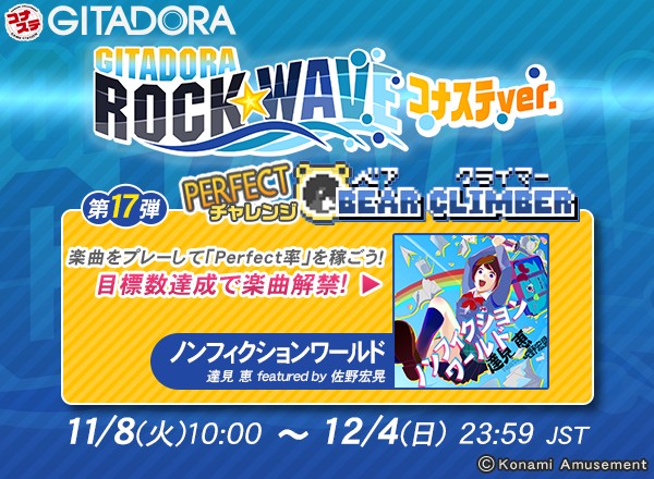 11/8(火)の #コナステ #ギタドラ は「GITADORA ROCK WAVE コナステver.第17弾 PERFECTチャレンジ BEAR CLIMBER」を開催! Perfect率をためてビルを登れ! 目標達成で楽曲「ノンフィクションワールド」がコナステで解禁! コナステGITADORAで遊べるようになるぞ! このチャンスを見逃すな!