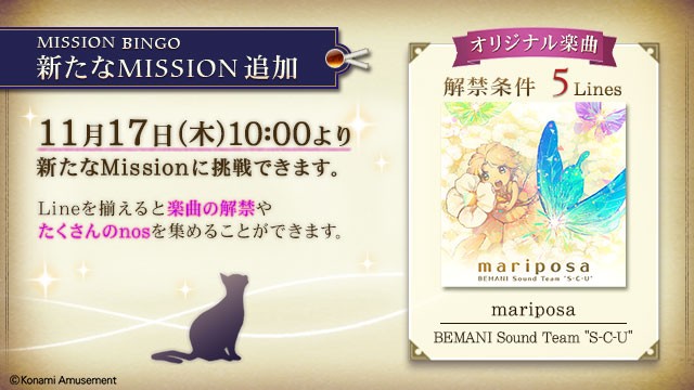 【 MISSION BINGO 】 11月17日(木)10:00より、「MISSION BINGO」に新たなMissionが追加。縦・横・斜めのLineを揃えて楽曲を解禁しましょう! #ノスタルジア http://eagate.573.jp/game/nostalgia/op3/news/entrance.html#20221116-01