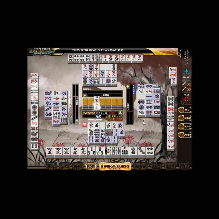 リーグポイントほしさに深夜コナステにて東風戦を少々 配牌西あったので四風連打で流すこともできましたが、ドラが暗刻だったので続行した結果がこのザマです😅 カラ聴vs山1対決乙