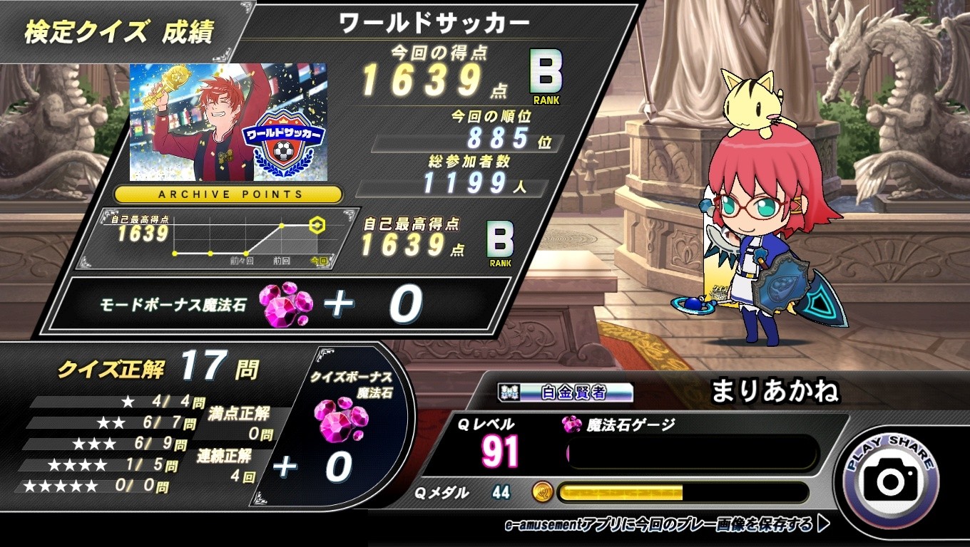 12月18日のプレー結果。ワールドサッカー検定をプレー。 自己ベストスコアは更新しましたがBランク止まり。