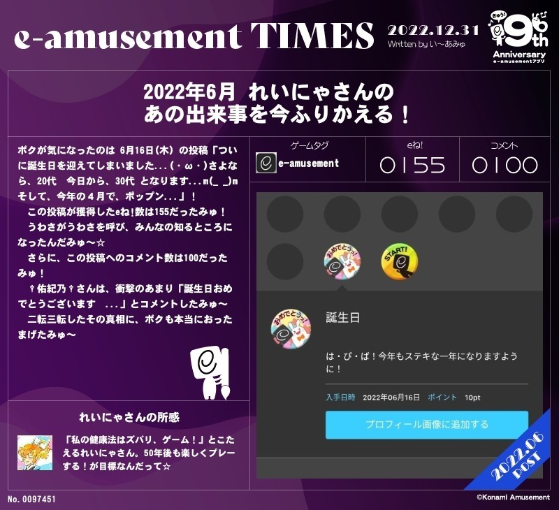 2022年6月のイーアミュ新聞📰 6月は私の誕生日でして、 イーアミュの皆様から、 たくさんの、eね!や コメントをいただいていました(^ω^) 皆様、本当にありがとうございますヽ(*´∀`*)ノ✨