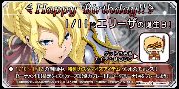 おめでとうございます! 1/11(水)はエリーザ先生の誕生日! 1/10~1/12の期間中にQMAをプレーしてお祝いしましょ~! 条件を満たすと特別なアイテムをゲットできますよ! #QMA #誕生日 #夢幻の鏡界 http://eagate.573.jp/game/qma/17/event/BD.html