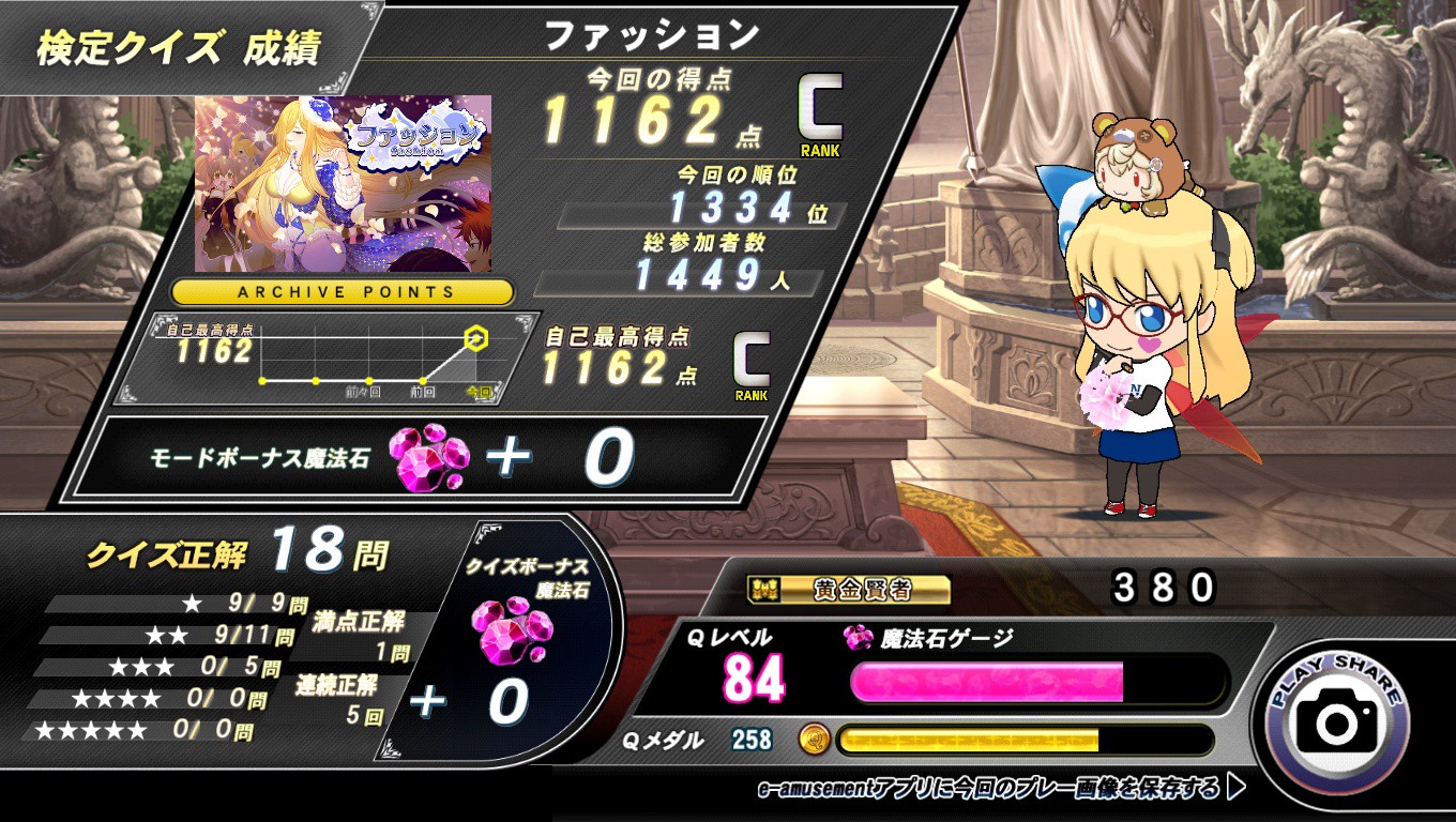 1月18日は、ファッション検定を1回、マジックコロシアムを1回プレー。 最初に、ファッション検定の成績です。 初見プレーでCランクでした。 香水や服etcの問題はほぼお手上げですね。 少しずつ勉強していきたいです。