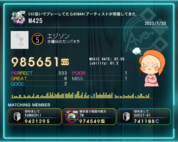 昨日(1/20)の悔しいくらいのやらかし Lv5 エジソン(ADVANCED) 1POOR、1MISS & SSS ブーストミッションにLv5でスコアを850000以上取るミッションがあったので選曲。 SSS取れたのは嬉しいけどフルコン逃しは悔しすぎる(´°̥̥̥̥̥̥̥̥ω°̥̥̥̥̥̥̥̥`) #jubeat