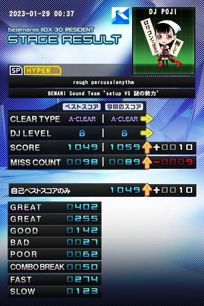 昔は弐寺なんか無理ゲー(ヾノ・∀・`)って思ってた。 灰譜面やLV9譜面なんかもっと無理って思ってた。 それが今、LV9譜面も少しずつクリアできる様になりました ここまで成長したのもビバゾン糸魚川があったお陰。 改めてビバゾン糸魚川………本当にお疲れ様でした。
