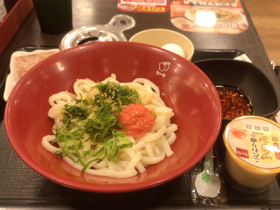 #なか卯 明太子釜玉うどん 並 こだわり卵 食べラー プリン 美味しかった♪