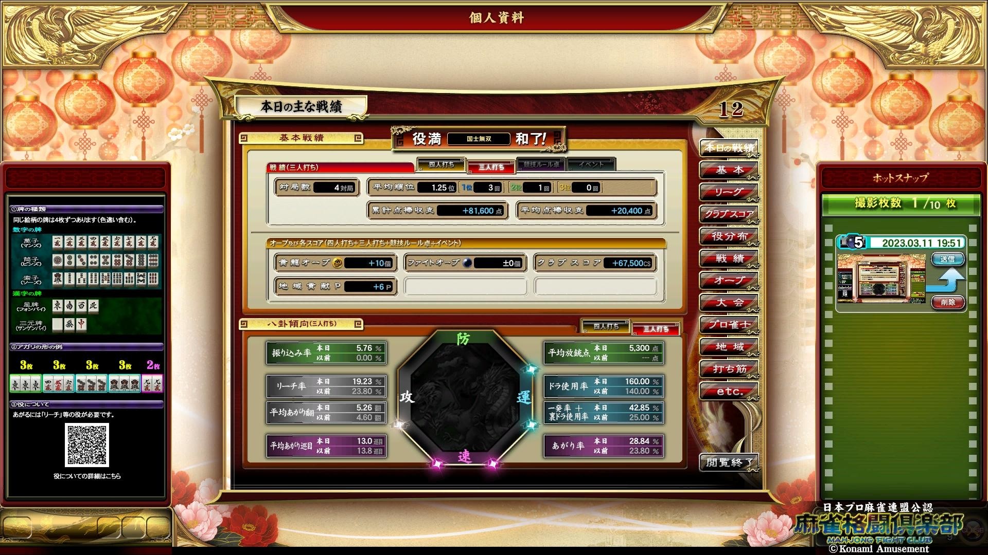 さっきupした親倍が今日の最高打点かと思いましたが、 3戦めに国士無双あがりました。 ラスめのオーラスで配牌が8種9牌。 初巡のツモで9種10牌になったので向かいました! (で、ホットスナップ押し忘れましたw)