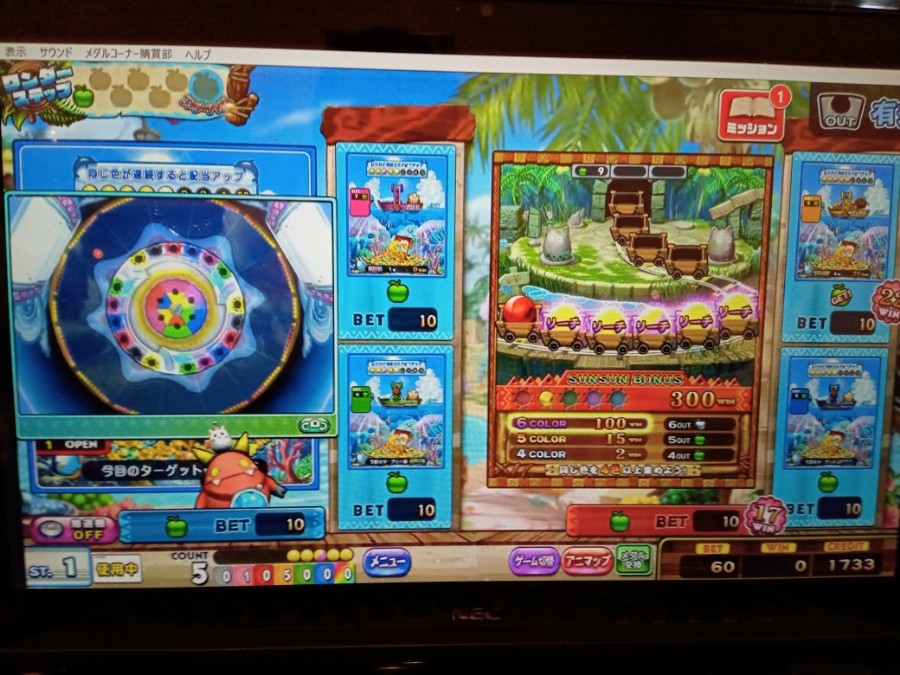 開幕5連続の黄色。トロッコのベットタイム時、黄色無かったため4カラーの次に5カラー。一番右が黄色なら6カラーだった。
