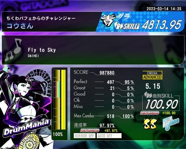3/14日分、Fly to Sky(黄ドラム)をプレイ