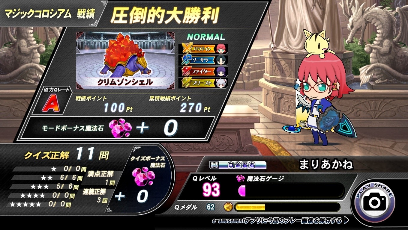 マジックコロシアム4回目。パラディンを選択してバトル開始。 12問目で決着して結果は圧倒的大勝利。