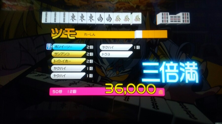 “三”“アン”コ、ドラ“三”、その他もろもろ乗っかって“三”倍満。 これがやりたかった“三”尽くし。 “アン”コク・“ミツ”バ様、暗黒神への供物に御座います。