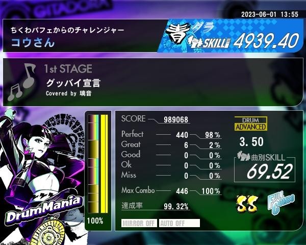 6/1日分、グッバイ宣言(黄ドラム)をプレイ