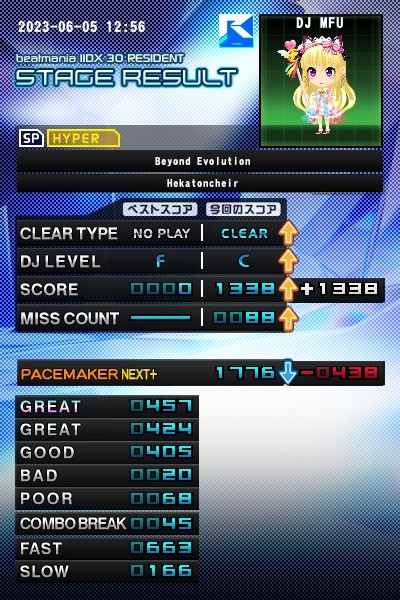 SPビヨンドエボリューション灰、ノマゲクリア出来ました。中盤で60パーセントぐらいだったけどそこからは回復地帯でした。DP灰も易でやったけど中盤まで空だったけどそこから回復して行ってラスト前で60パーセントになっててラストのHCN取ってたらみるみる回復して行ってパーセントを見てたら88パーセントぐらいになってクリア出来たと思ってたら66パーセントでした。最後にHCNを放さなかったみたいでゲージ削られてました。