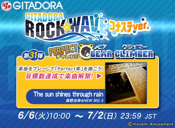 6/6(火)より #コナステ #ギタドラ にて「GITADORA ROCK WAVE コナステver.第31弾 PERFECTチャレンジ BEAR CLIMBER」を開催! Perfect率をためてビルを登れ! 目標達成で楽曲「The sun shines through rain」がコナステで解禁! コナステGITADORAで遊べるようになるぞ! このチャンスを見逃すな!