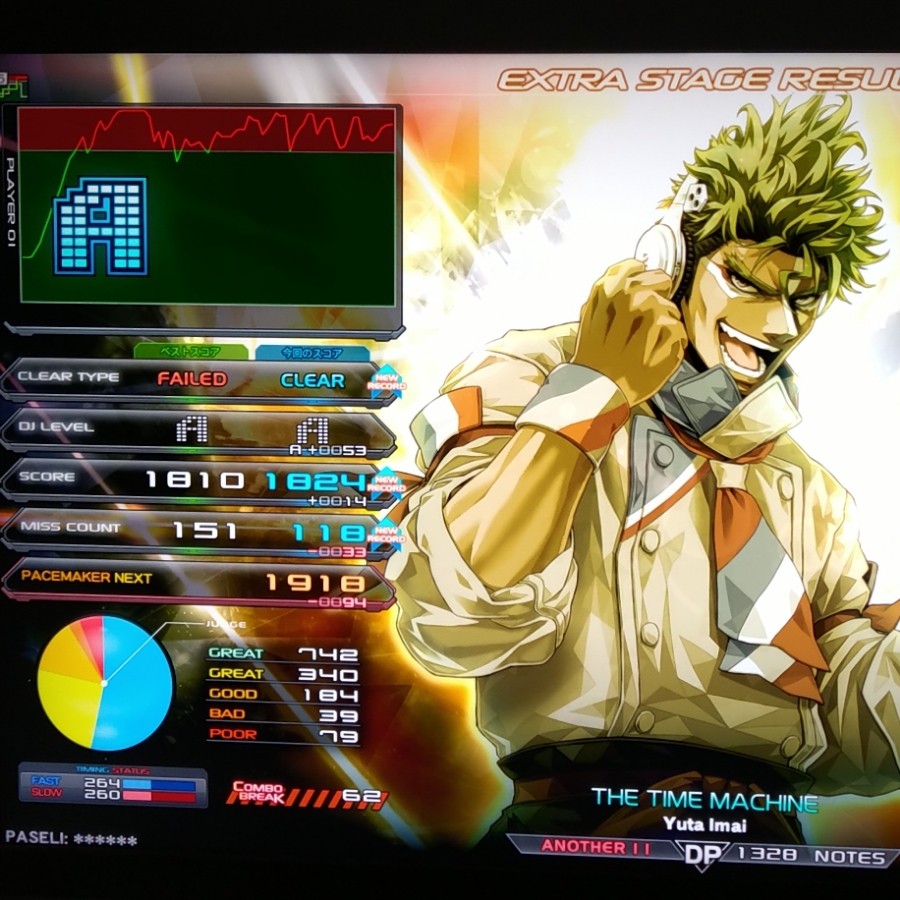 THE TIME MACHINE DPA☆11 RESIDENTデフォ曲やっとできた💡 ミスカウント減ったけどその割にスコア伸びず… そつなくこなしたってこと? グラフはギザギザだけど💧
