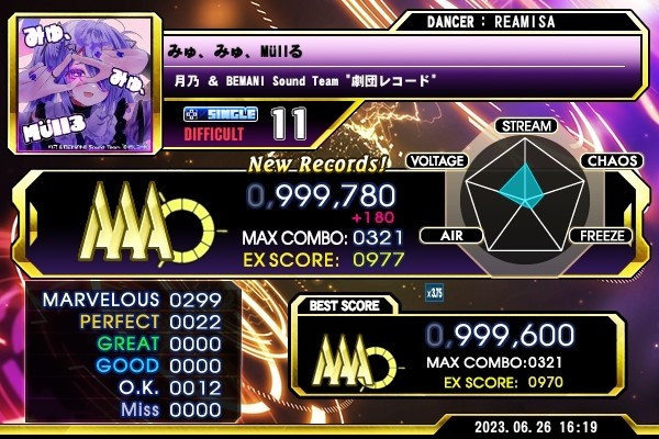 2023年6月26日にプレイした「みゅ、みゅ、Müllる」の[SINGLE DIFFICULT]譜面。自己ベストを180点も更新しちゃいました。 #DDR_A3