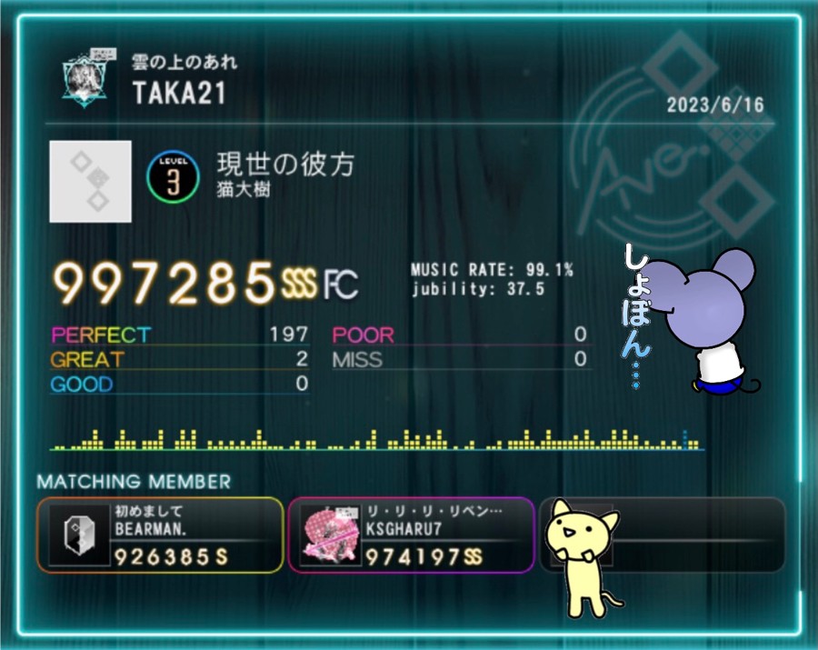 jubeat 6/16分。 フルコンチャレンジは「現世の彼方」(BSC)ですね。 後ろのポップンからPing×Ping×Dashが流れてきて気を取られそうですが💧 でも終盤まで調子良く進ん… あ゛ーっっ!? あと8ノーツでEXC 逃した!(;ω;)