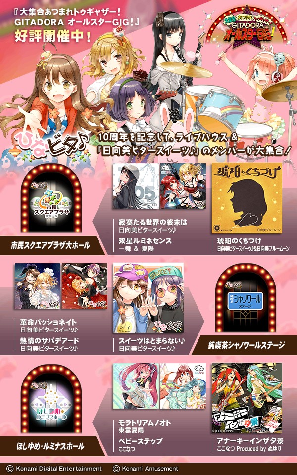 【倉野川に大集合♪】 『大集合あつまれトゥギャザー! GITADORAオールスターGIG!』開催中! 8/2(水)より『ひなビタ♪』10周年を記念した新ライブハウスが登場! 『日向美ビタースイーツ♪』のメンバーも大集合♪ #GITADORA #GITADORA_FUZZUP