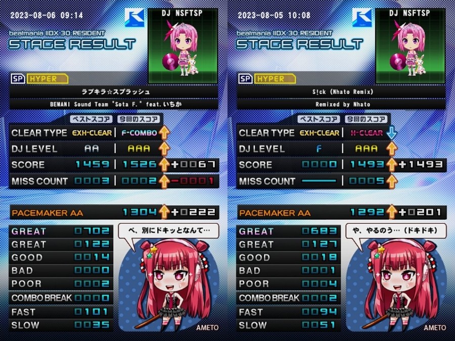 SPサイド単発編。 SPサイドスコアタ系収穫集。 ・ラブキラ☆スプラッシュ (SPH・Lv8):新規鳥コン (INFでは個別達成) https://twitter.com/MSL_nsft_fftp/status/1688908230007861248 ・S!ck (Nhato Remix) (SPH・Lv9):新規AAA ここまで手こずらせたいちかちゃんは悪い子です。 これにてラブキラ(SPH)AC・INF両サイド決着しました (^^; 他のいちかちゃん曲よりもスコアタ・フルコン狙い共に苦戦してましたね。