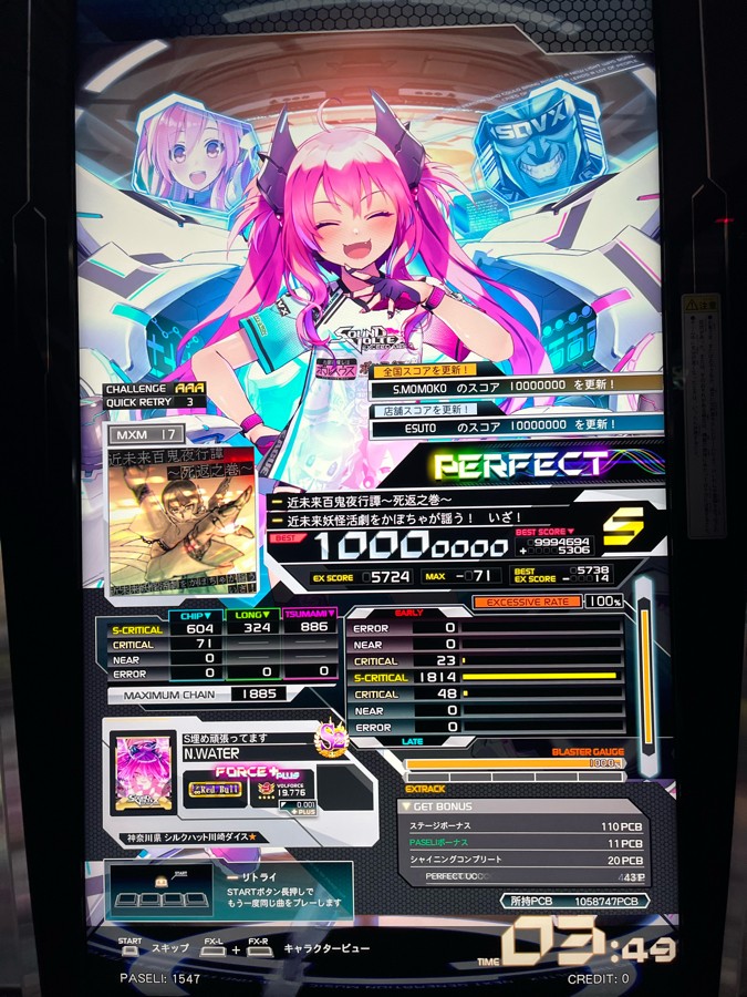 8月10日 近未来百鬼夜行譚〜死返之巻〜 MXM 17 17PUC 20曲目 個人的にめっちゃ好きな曲をPUC出せたから嬉しい! 19.775→19.776 17PUCだしてもVOLFORCEが上がらなくなる時が近づいてきてる