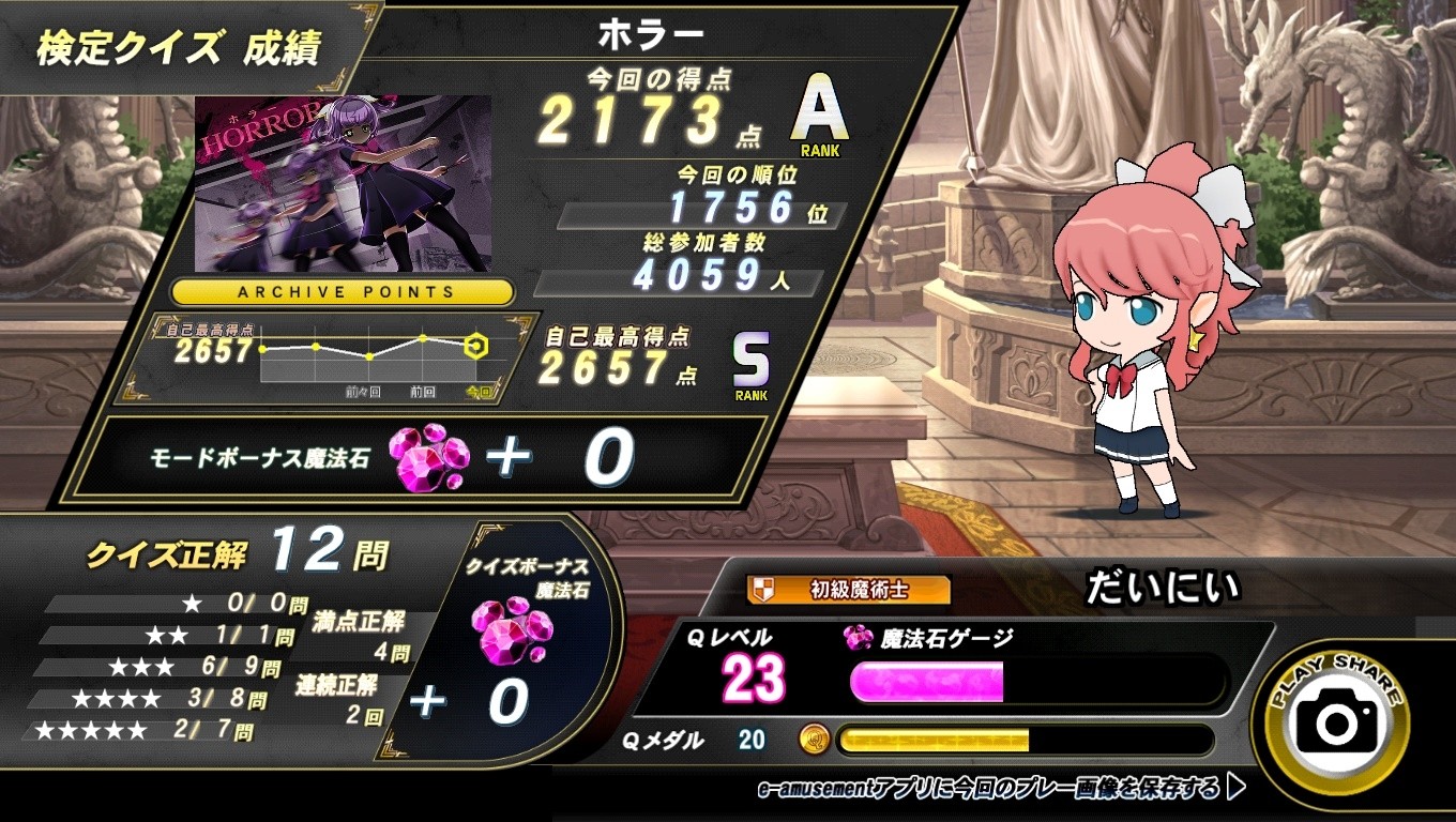 QMA黄金の道標を5クレ。 メイン(だいにい@メディア)…検定クイズ×5(アニマル×1,ホラー×2,アイドル×2)。 画像は本日のホラー検定の最高スコア。 ◆プレイヤー情報 https://ameblo.jp/dai2san/entry-12813473480.html @ソニックワールド大村店
