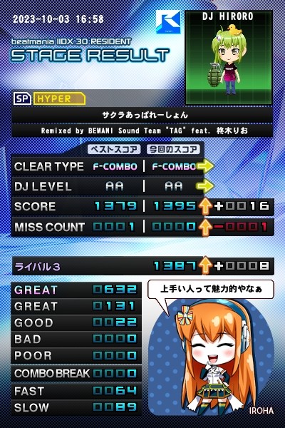 SP☆7 サクラあっぱれーしょん(H) おにたばさんから8点のプレゼントがあった曲。 アップにちょうどいいのでやったら、8点の返品に成功しました(/^^)/⌒●~*