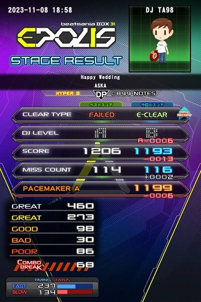 Happy Wedding (DP)灰☆8易付きクリア!今作の六段一曲目。混フレが多く一回バタつくと余計な押し間違いを連発してダダ崩れするのがパターン化しかけていましたがラストで回復が間に合いました。個人的にはユーロマ灰より難しいと思います。