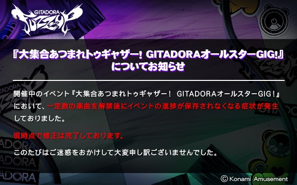 【GITADORA FUZZ-UP から重要なお知らせ】 現在開催中の『大集合あつまれトゥギャザー! GITADORAオールスターGIG!』のについてお知らせがございます。 詳細は画像をご確認ください。 このたびはご迷惑をおかけして大変申し訳ございませんでした。 #GITADORA #GITADORA_FUZZUP