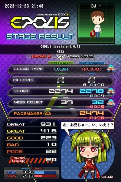 アケにて☆12ハード 10曲達成 トリカゴノ鳳凰😁 THE DEEP STRIKER† Arabian Rave Night†😨 シュレーディンガーの猫 Burning Flame†😨 Welcome† CODE:1 [revision 1.0.1]😁😁 fallen leaves たまゆら 電光 相変わらず横判定がゴミすぎて、未だにジャリッとしてる譜面は見えない。脳の認識力が欠落してる。普通の人より。 Proof of the existenceとかRUGGED ASH†とかメチャクチャ嫌い。 😁→超嬉しい 😨→落ちかけた 😓→苦労した