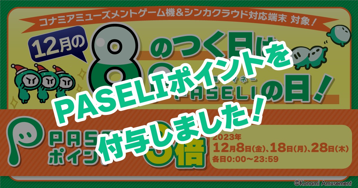 先日開催した「12月の8のつく日はPASELIの日」へのご参加ありがとうございました。 対象者の皆様にPASELIポイントの付与を完了いたしました。 今後ともPASELIでお楽しみください! PASELIポイントの残高や付与履歴はPASELIチャージサイトからご確認ください。 https://paseli.konami.net/charge/top.html