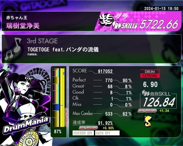 『TOGETOGE feat. パンダの流儀』DRUM EXTREME この曲がスキル値一番になりました。280BPMほんとすき。